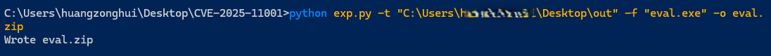 python exp.py -t "C:\Users\username\Desktop\out" -f "eval.exe" -o eval.zip