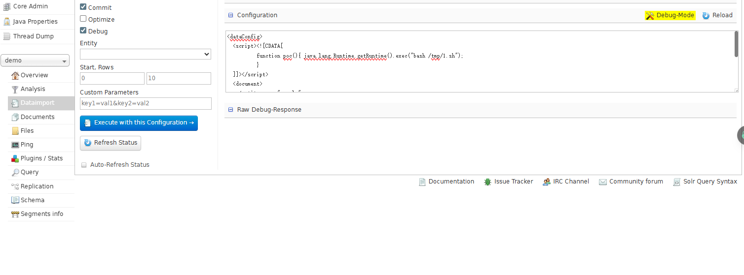 首先在页面左侧选择 demo 核心,打开 Dataimport 面板,开启右侧 Debug mode,填入以下 POC: