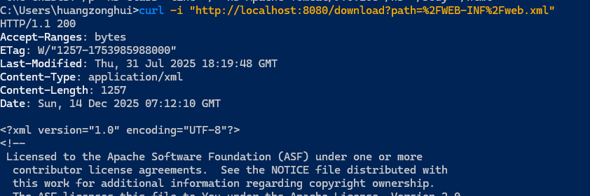curl -i "http://localhost:8080/download?path=%2FWEB-INF%2Fweb.xml"